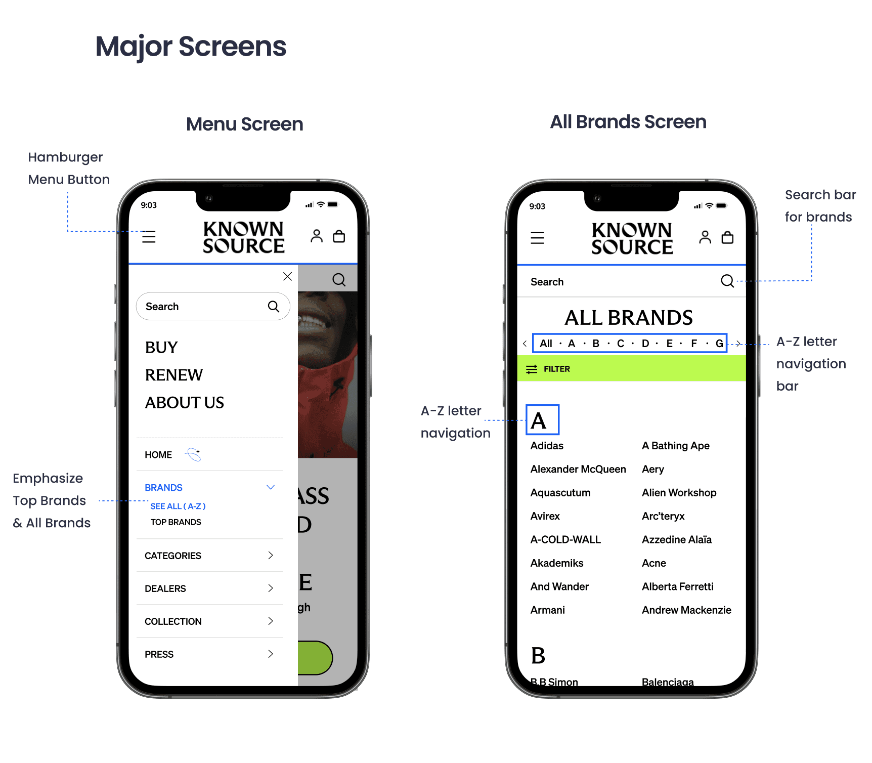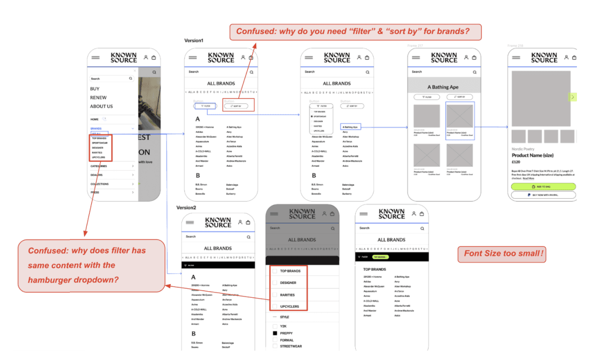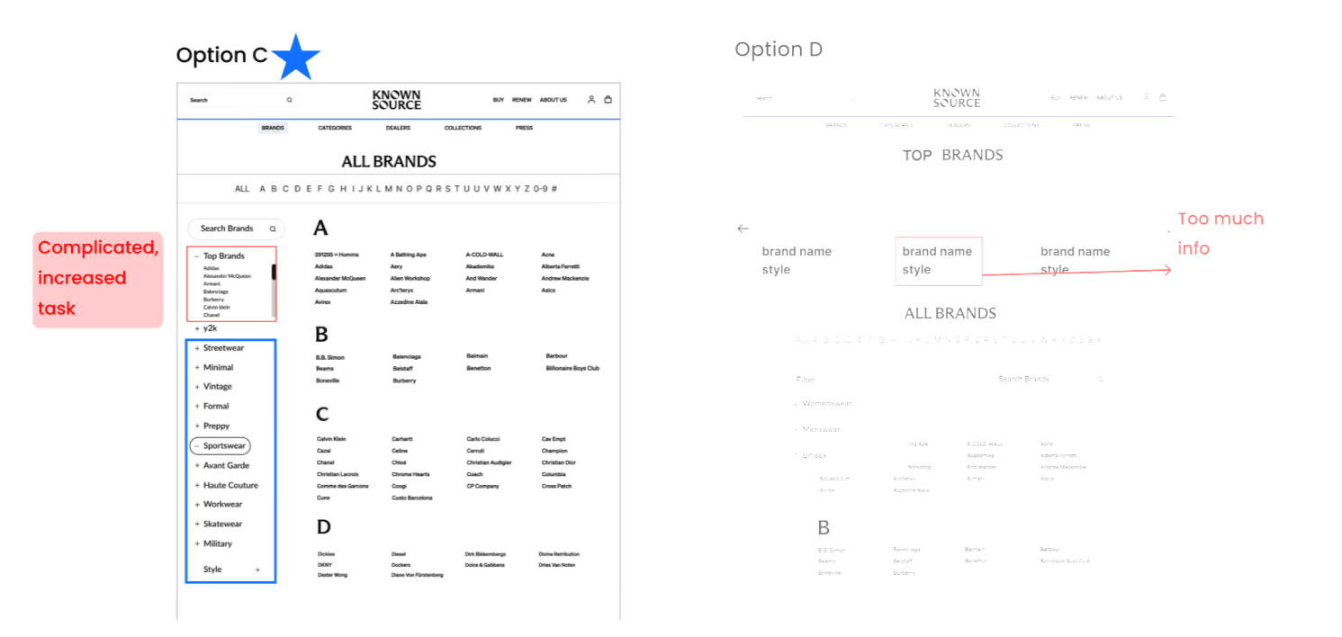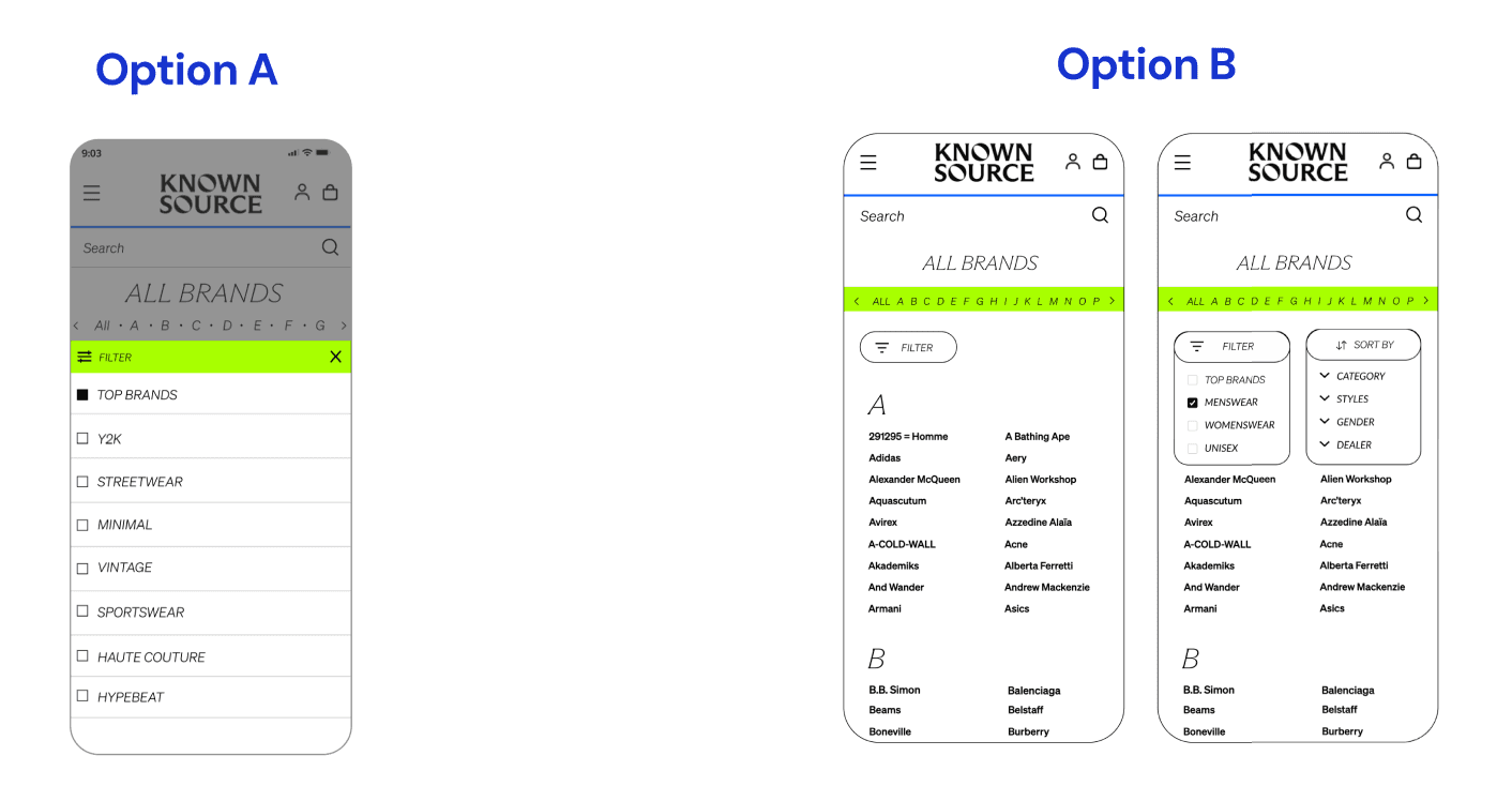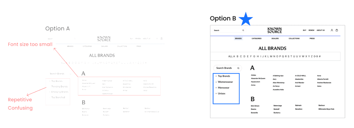 KnownSource, a second-hand fashion shopping website, was experiencing high drop off rate because users fail to find the desired brand on the brands directory page. In order to improve the navigation and increase conversion rate, our team introduced a filter feature and clear alphabetical visual hierarchy, resulting in improving navigation efficiency by 18% and driving a 5% increase in conversion rate.