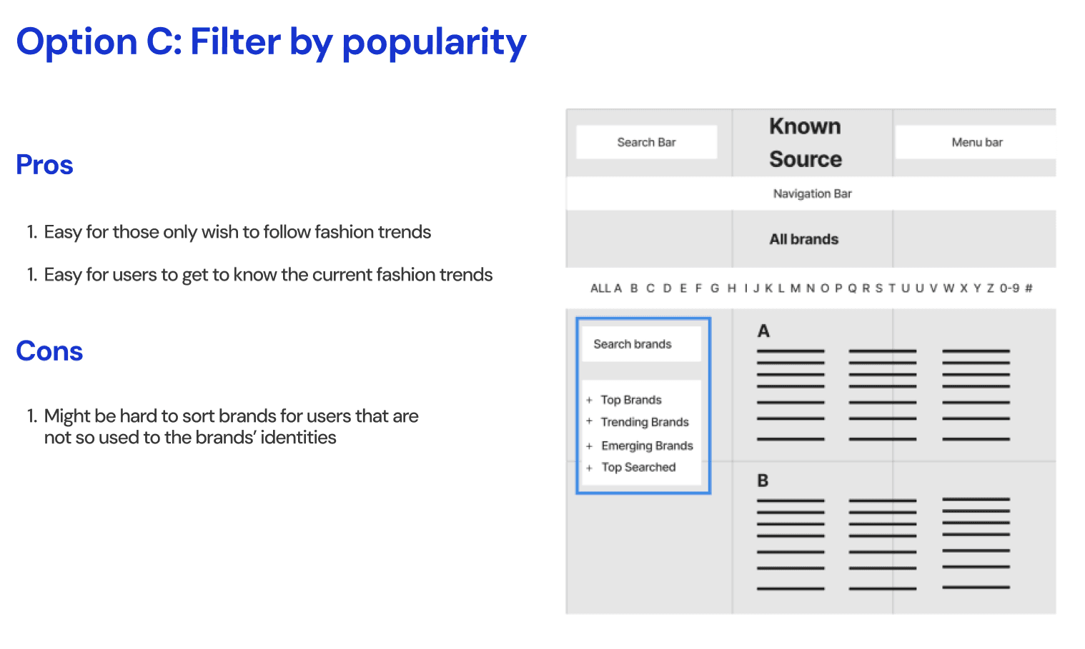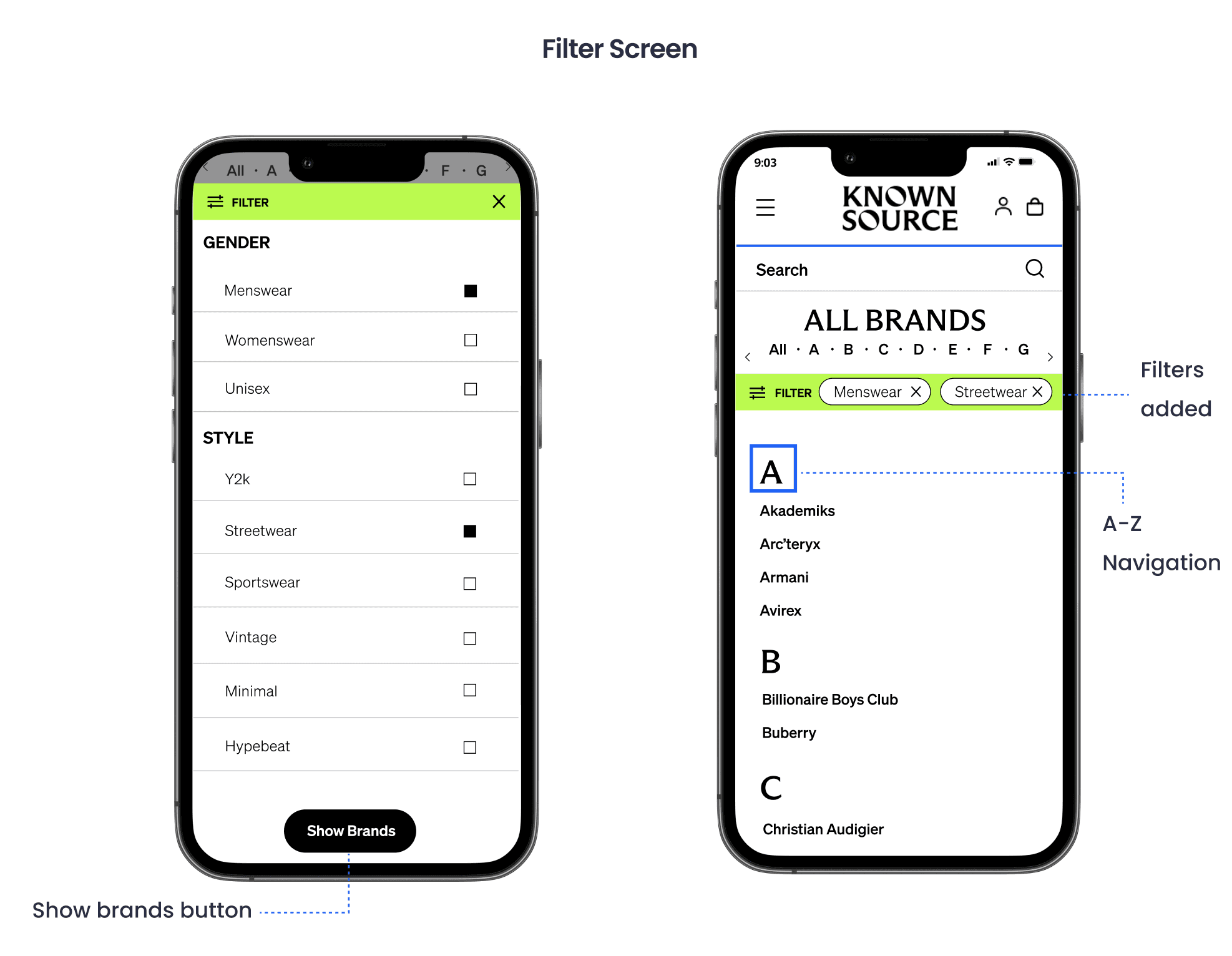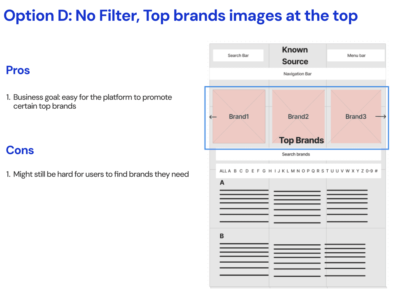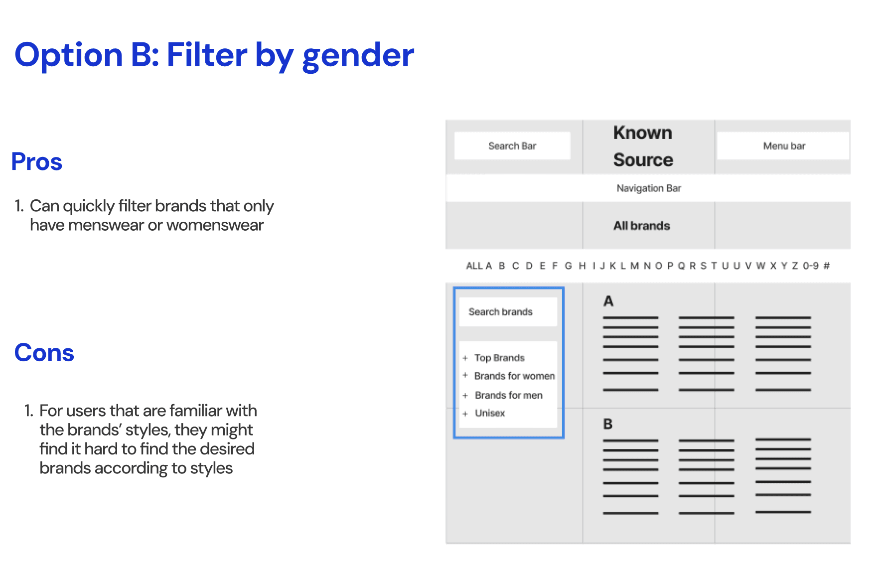 KnownSource, a second-hand fashion shopping website, was experiencing high drop off rate because users fail to find the desired brand on the brands directory page. In order to improve the navigation and increase conversion rate, our team introduced a filter feature and clear alphabetical visual hierarchy, resulting in improving navigation efficiency by 18% and driving a 5% increase in conversion rate.