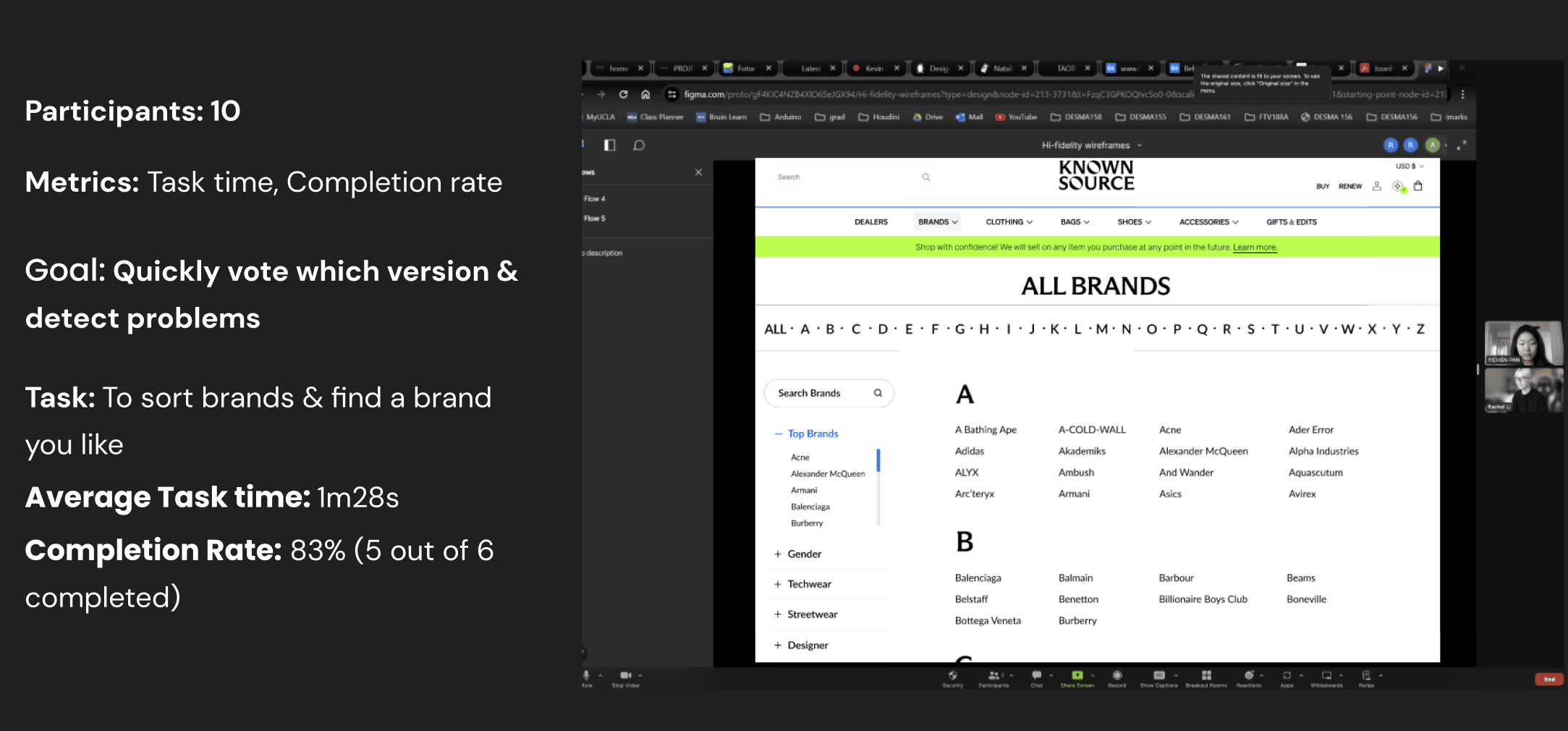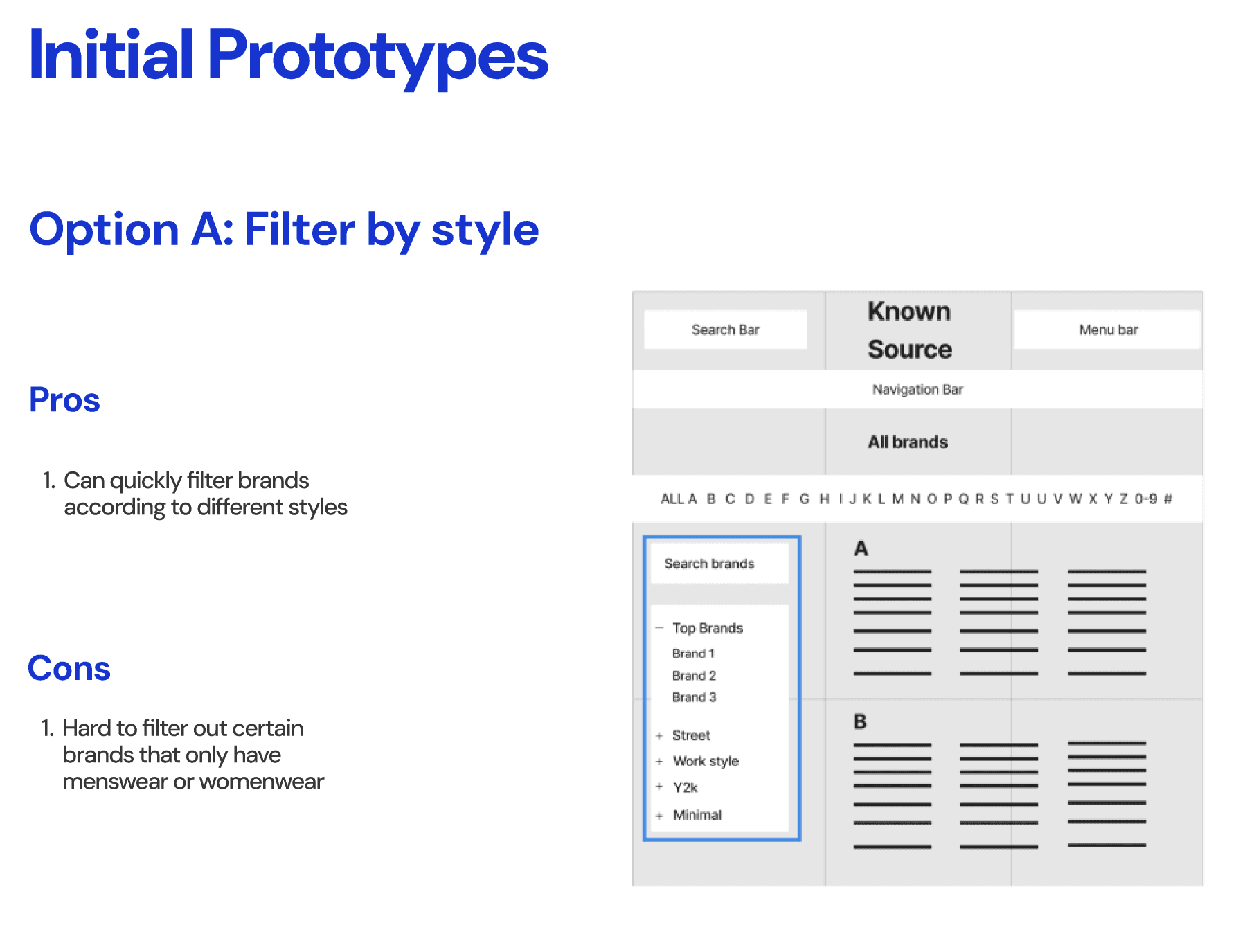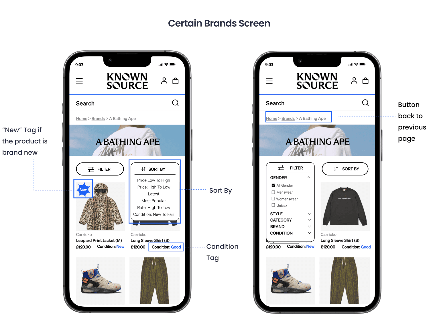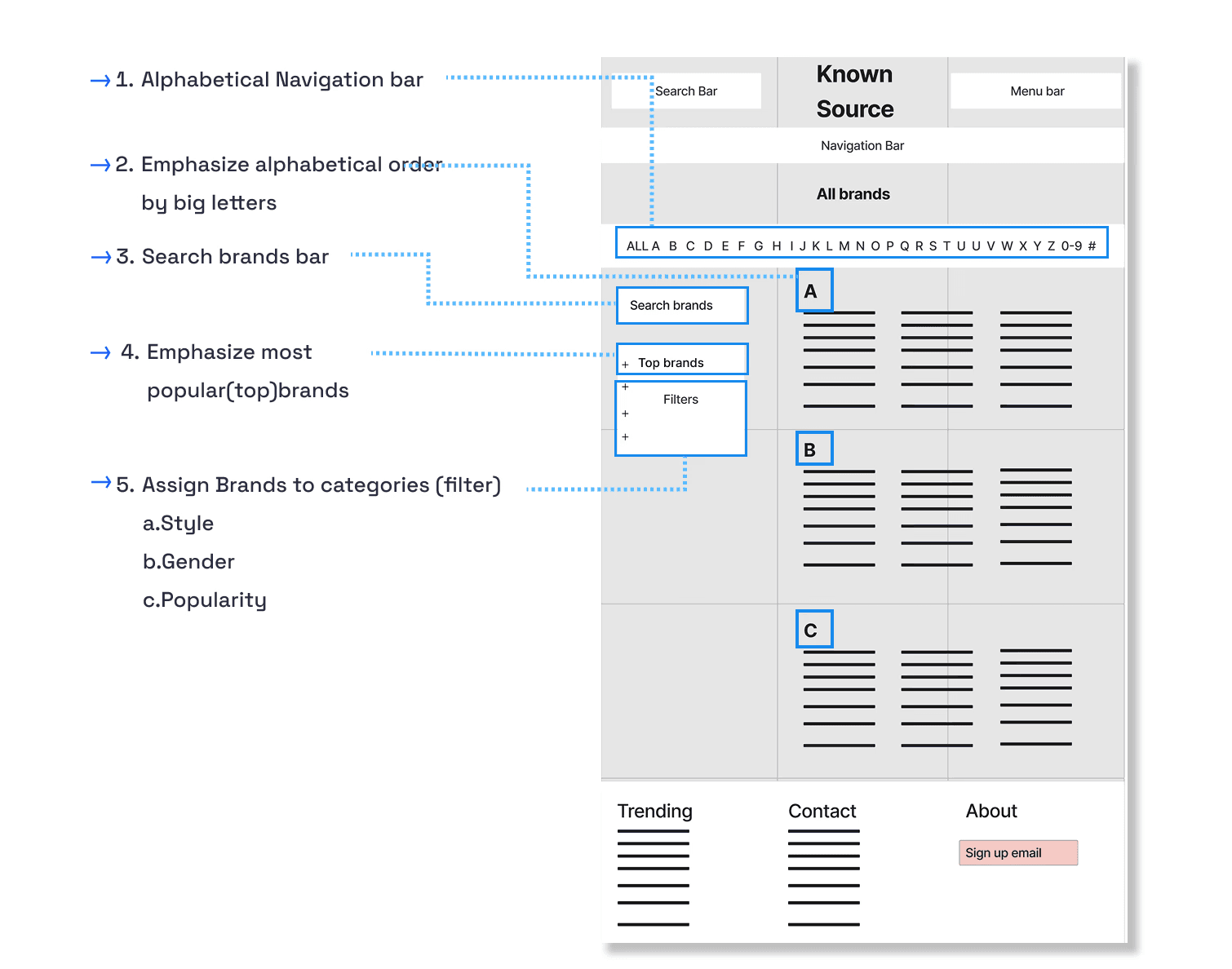 KnownSource, a second-hand fashion shopping website, was experiencing high drop off rate because users fail to find the desired brand on the brands directory page. In order to improve the navigation and increase conversion rate, our team introduced a filter feature and clear alphabetical visual hierarchy, resulting in improving navigation efficiency by 18% and driving a 5% increase in conversion rate.